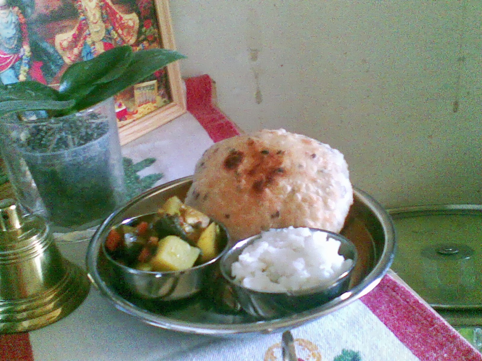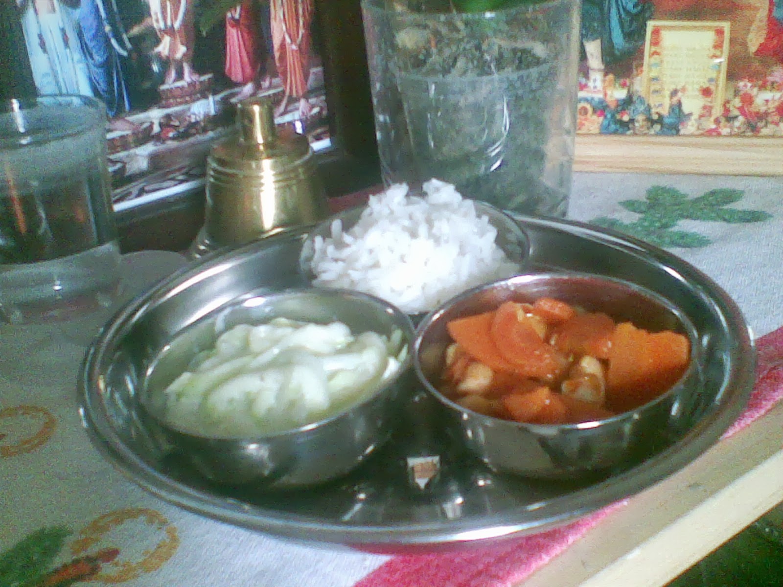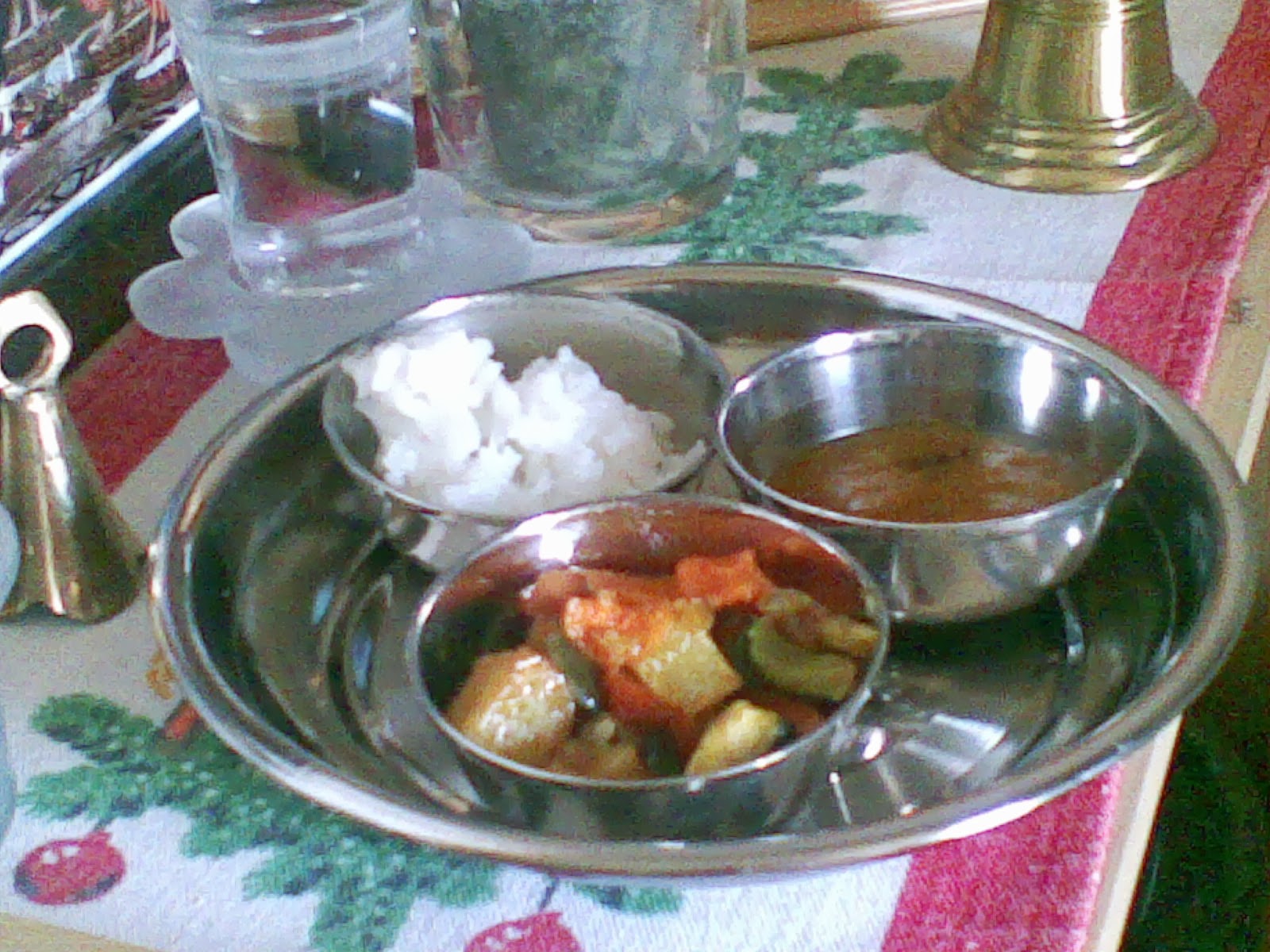 | főtt szabdzsi, gyömbéres rizs, lenmagos puri