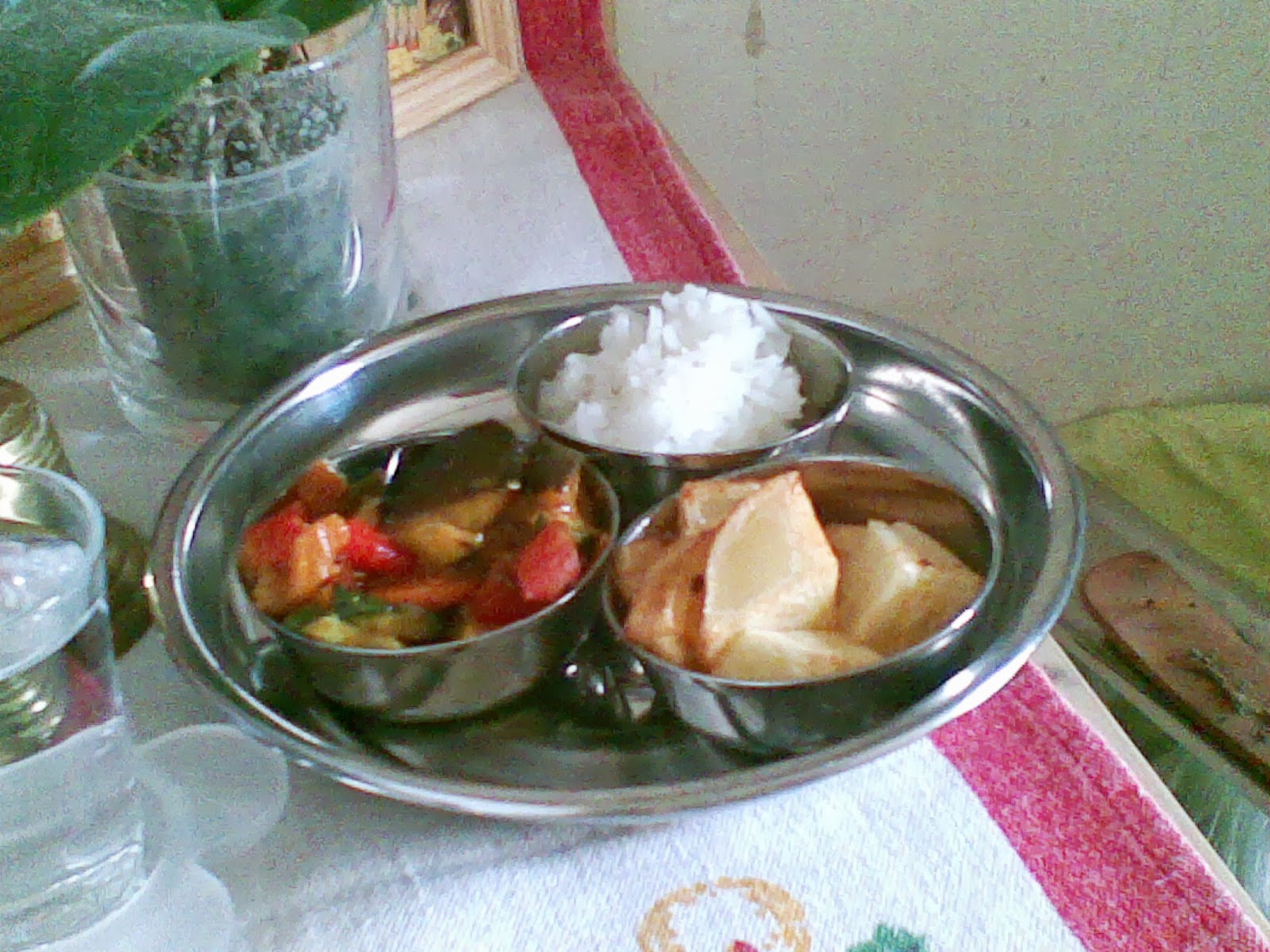 | paradicsomos sült szabdzsi, sült krumpli, főtt rizs |